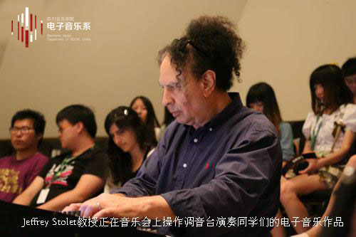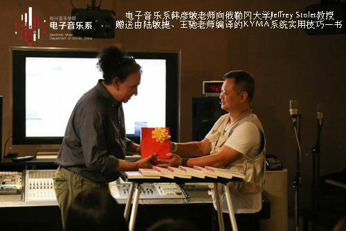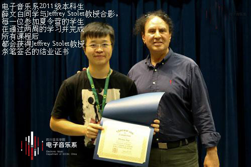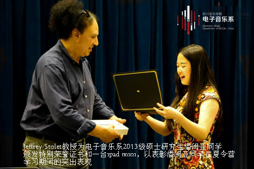 8月2日,通过两周的学习,此次电子音乐夏令营专场汇报音乐会在俄勒冈大学音乐学院音乐厅成功举行,本次音乐会上演的作品选用的声音素材全部是在美国采样实录,通过同学们自己的创意并利用KYMA声音系统强大的计算引擎将素材声音进行变形、拼贴、重合成等技术制作出一首电子音乐作品,并通过音乐会现场的8声道数字音频回放系统,由Jeffrey Stolet教授亲自操作调音台进行环绕声场的转换来呈现给到场的听众。12名川音同学的电子音乐作品不负重望获得了在场听众和Jeffrey Stolet教授的一致好评。音乐会结束后,Jeffrey Stolet教授还为每位参加夏令营的同学颁发了结业证书,并为我系的2013级硕士研究生潘闽亚同学颁发了特别荣誉证书和一台ipad mini,以奖励潘闽亚同学在此次夏令营期间各方面突出的表现和取得的优异成绩。
