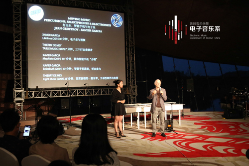 6月18日晚,格拉姆电子音乐专场音乐会《Moving Music——打击乐,智能手机与电子乐》在麓湖艺展中心成功举行。在音乐会上,既有格拉姆的音乐工程师独自完成的作品,也有与音乐学院的同学们共同完成,另外还有与现场观众互动的作品,整场音乐会作品形式丰富、精彩纷呈。其中,作曲家、跨媒介音乐演奏家Xavier Garcia的作品《Mephisto》、《Belzebuth》,由格拉姆艺术创研中心技术总监Christophe Lebreton和Jeam Geoffroy担任电子音乐现场技术支持,与电子音乐系的同学们以及现场听众共同配合完成。作品《Mephisto》利用乐器合成技术程序Smart Faust的成果运用到创作实时演奏中,所有的电子音色均来源于现场演奏者的智能手机,程序将智能手机的重力感应器技术运用到电子音色实时处理中,赋予现场演奏具有互动音乐的特征,演奏者与智能手机发出的声音之间表现出准确且灵活的同步关系。