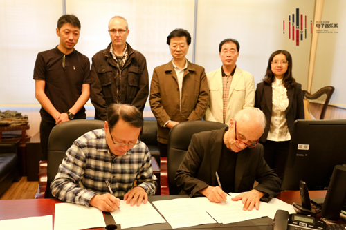 电子音乐系主任胡晓教授,格拉姆国立电子音乐创研中心主任詹姆斯教授分别代表双方签署了中法战略合作协议。