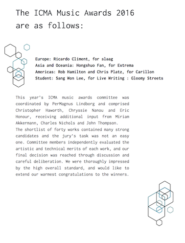 2016年是ICMA年会举办42周年,由荷兰乌得勒支艺术大学主办。来自世界各国的100余名国际评审专家从世界各国投交的600余部作品中评选出四项大奖:欧洲地区获奖者Rcardo Climent,北美地区获奖者Rob Hamilton与Chris platz(合作)、学生组获奖者Sang Won Lee,亚太地区获奖者范弘硕(伟德bv国际体育)。这也是中国艺术家第一次在最具含金量的ICMC国际赛事中夺得大奖。