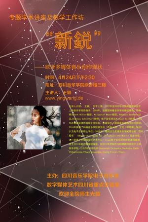 主讲人介绍:王颖,生于上海,1997年至2002年以优异成绩毕业于上海音乐学院作曲系。2003年,赴德国科隆音乐学院继续深造,作曲师从York Höller教授,Krzysztof Meyer教授,Rebecca Saunders以及Johannes Schöllhorn教授;电子音乐师从Michael Beil教授。2007年在德国获得作曲硕士学位后,被直接升入德国最高作曲学位大师班,2010年获得了科隆音乐学院颁发的‘作曲大师’文凭(等同博士学位)以及电子音乐硕士学位。2009年,得到法兰克福音乐学院特设的‘现代音乐’(Masterstudiegang für Zeitgenössiche Musik)硕士学位。2011获得了巴黎蓬皮杜艺术中心-Ircam电子音乐研究所的课程邀请,并于2012年赴巴黎继续深造。自2013年开始作为特聘教师任教于上海音乐学院。已合作的乐团包括:Guezenich Orchestra,Deutshe Radio Phiharmonie,Phace Ensemble,Klang Forum Wien。