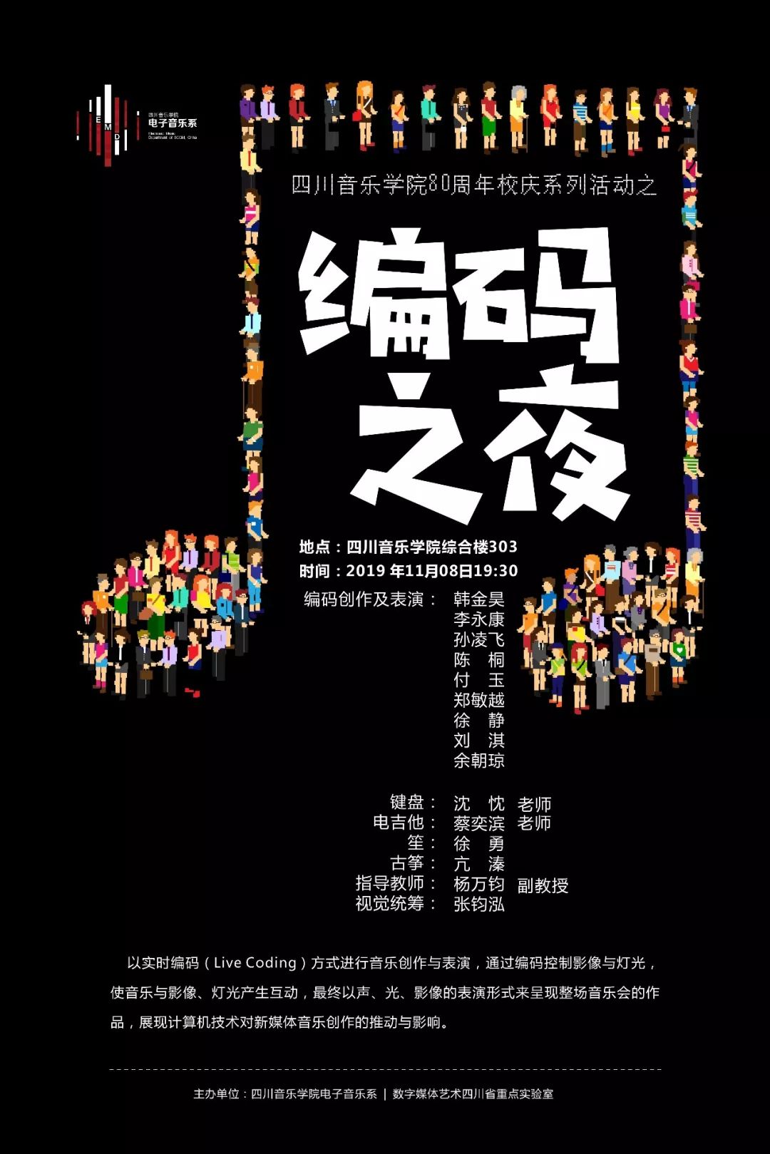 计算机与音乐艺术结合应该是什么样的?写代码的是否都是程序猿?怎么通过计算机编码来创作音乐作品?我们应该如何使用声、光、影等媒体形式和计算机科技的力量来呈现新媒体音乐?11月8号(周五)晚19:30,伟德bv国际体育综合楼303,让我们一起来探索吧。敬请光临,不见不散! 地点:伟德bv国际体育综合楼303 时间:2019年11月8日19:30 主办:伟德bv国际体育电子音乐系 数字媒体艺术四川省重点实验室