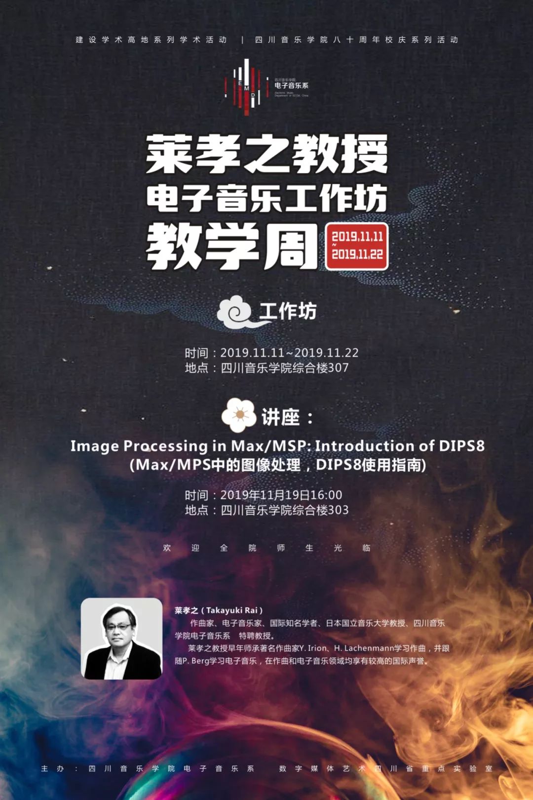 讲座 Image Processing in Max/MSP: Introduction of DIPS8 (Max/MSP中的图像处理,DIPS8使用指南) 时间:2019年11月19日16:00 地点:伟德bv国际体育综合楼303 欢迎全院师生光临! 莱孝之(Takayuki Rai) 作曲家、电子音乐家、国际知名学者、日本国立音乐大学教授、伟德bv国际体育电子音乐系特聘教授。莱孝之教授早年师承著名作曲家Y. Irion、H. Lachenmann学习作曲,并跟随P. Berg学习电子音乐,在作曲和电子音乐领域均享有较高的国际声誉。