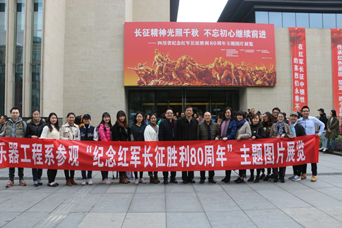 “红军不怕远征难,万水千山只等闲,五岭逶迤腾细浪,乌蒙磅礴走泥丸……”长征,是一首雄壮、豪迈、大气磅礴的革命交响曲! 长征,把惊涛壮观推出,把日出瑰丽托起,让松柏昂首挺拔,让雄鹰翱翔蓝天! 11月8日,乐器工程系党总支全体党员干部及学生代表,在系党总支陈杰书记的带领下,乘车前往四川省图书馆参观了“纪念红军长征胜利80周年”的图片展。 在进入展厅的时刻,大家都被一幅幅当年红军战士在革命战斗中顽强不屈的精神所震撼了。当天来图书馆参观的观众也包括了我院其他院系及省市多家单位的党员干部代表,大家都不停的驻足观看每一副图片,分享这红色精神食粮带给大家的快乐与心灵的洗礼。 80年前红军二万五千里长征的艰辛,它见证了我们中华民族的艰险历程,体现了中国的辉煌与僮景,矗立起长征者不怕牺牲、不畏艰险、不屈不挠、艰苦奋斗的英勇形象。 想想我们今天幸福美好的生活,你曾想到,这是革命烈士抛头颅,撒热血换来的,我们应该珍惜着幸福的生活,好好工作与学习。我们只有在为远大理想的顽强奋斗中,人生抱负才能真正实现,人生道路才会焕发光彩。 长征给我们的启示:一个民族,一个国家,只要有艰苦奋斗的精神和不畏艰辛、积极向上的生活态度,就一定能够成就事业,创造辉煌。要树立历史责任感,“国家兴亡,匹夫有责”,从我做起,从小事做起,从现在做起,努力工作学习,时刻准备着,为祖国、为人民奉献自己,让长征精神永远流传下去,让长征精神化作一种不朽的精神,光照千秋、流芳千古!