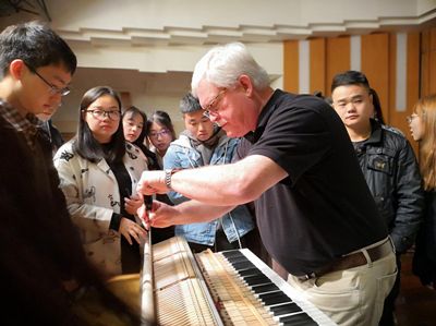 2018年11月9日,美国欧柏林音乐学院钢琴技术部主任约翰-卡瓦诺老师,在四川音乐学校小音乐厅举行了关于三角钢琴整音、修理、调整等内容的专题讲座。约翰老师详细的向师生们介绍了关于钢琴调律中常见维修问题,逐一的耐心解答大家的问题。乐器工程系钢琴调律教研室全体教师与钢琴调律专业全体学生参加了此次讲座,教师们针对在钢琴调律教学内容、钢琴结构、钢琴选材等方面进行了长时间的交流探讨。 通过本次讲座以及师生互动,老师同学们更深入的了解了钢琴调律相关理论和技术,丰富了专业知识,拓展了学术视野,为以后的本科学习提供了专业性的指导。
