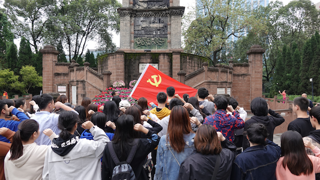 按照学校《“不忘初心、牢记使命”主题教育工作方案》的通知要求,结合电子音乐系党总支主题教育工作计划。10月14日中午,电子音乐系党总支全体师生、本科二年级全体同学共计51人,前往成都市人民公园,接地气地走到场景中去,利用本地红色资源,实地开展了一次与微党课、教改思政课结合的,“我和我的祖国”主题党日活动。 英雄,是民族的脊梁,传承红色基因,不忘初心、继续前进,是我们对英雄的最好纪念。系党总支邓舒副书记在烈士纪念碑下向师生们生动地讲述了四川保路运动的革命历史,它为武昌起义爆发创造了条件,它是中国近代史上的重要历史事件,它更是四川人民引以自豪的历史见证,并结合自己祖辈的经历,紧扣不忘初心,引导师生学习革命光荣传统,珍惜幸福生活,激发师生爱国热情。随后,师生们整齐列队,在党旗前,重温入党誓词,追思烈士们用宝贵生命实践共产党人初心的伟大革命精神和革命历程。 在本次党日活动中,为了扩大师生的参与度,党总支教工支部书记和学生支部书记也带头讲微党课,达到电子音乐系党总支班子成员全覆盖。教工一支部杨万钧书记在“壮士出川主题雕塑”前,结合川军将士出征的家国情怀,给师生上了一堂微党课,分享主题活动的思想感受,特别是改革开放带给国家和城市面貌的巨大变化,勉励党员师生认真做好自己的本职工作,提高思想认识,做一名合格的党员。教工二支部韩彦敏书记,在“川军抗日阵亡将士纪念碑”下,讲述在抗日抗战中出川300万川军,占到全国40%的兵力,共64万余人在浴血奋战中伤亡,当继承先烈红色基因,结合自己曾经当兵的经历和感触,给师生们上了一堂生动的微党课。 当天,大家还参观了“四川保路运动史事陈列馆”,陈列馆中收藏了大量革命烈士的珍贵实物、历史照片以及各类文献资料,让大家深受感染。大家纷纷表示,要坚定理想信念,不忘初心,牢记使命,以革命先烈不怕牺牲、甘于奉献的优良传统激励自己,充分发挥党员的先锋模范作用,为党的事业奋斗终身。最后,师生们还参观了《百里长街看成都》大型纪实摄影展,切身感受成都市的巨大变化,在习近平新时代中国特色社会主义思想指导下的发展硕果。 电子音乐系党总支开展的此次“祖国永在我心中”党日活动,既是一场红色记忆,又是一次思想之旅,让师生们提升了党性修养。师生们纷纷表示,我们在为中国的沧桑巨变欣喜自豪的同时,要继承和发扬先烈无私奉献的精神和开拓创新的勇气。推进自我革命,加强党的建设,增强“四个意识”,坚定“四个自信”,做到“两个维护”,要坚守“不忘初心,牢记使命”的精神,将所学所感转化为工作学习的动力,以积极饱满的工作热情,昂扬向上的工作状态,为大力推动电子音乐系的稳步发展和学校的改革发展做出积极贡献。