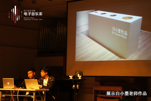 2012年10月24日受北京国际电子音乐节(MUSICACOUSTICA-BEIJING)组委会邀请,电子音乐系白小墨老师的作品《得广厦千间——为四只喇叭和谷粒而作》(Possessing A Thousand Houses for speakers and grain)在北京国际电子音乐节会场,中央音乐学院阶梯教室展演。我系学生吴一凡、范弘硕为观众进行作品的现场讲解。这首7分22秒的精彩作品立意新颖,哲学内涵丰富,在此次展演中得到国内外专家和观众的极大好评。 白小墨老师的电子音乐、装置和艺术作品曾多次在中国和美国的电子音乐节和当代艺术展中展演并获奖。
