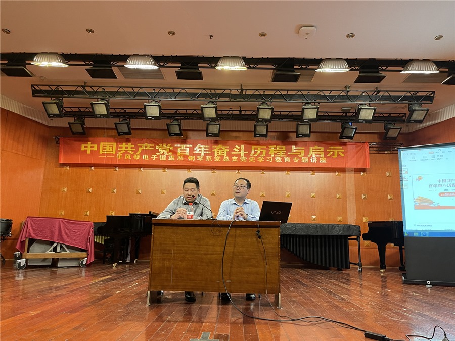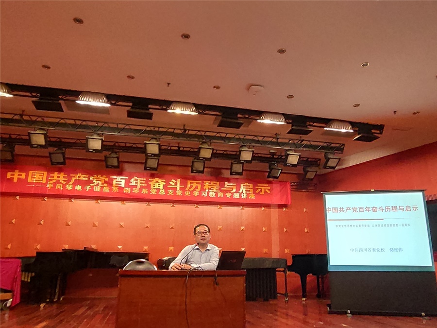 为贯彻落实学院党委党史学习要求,增强学习党史的自觉,不断把党史学习引向深入,钢琴系、手电系邀请省委党校储连伟副教授,于5月11日下午在星海音乐厅开展了题为《中国共产党百年奋斗历程与启示》专题党史讲座。两系全体教师、学生党员、部分学生代表共170人聆听了讲座。讲座由手电系党总支书记段川与钢琴系党总支副书记叶清兵共同主持。