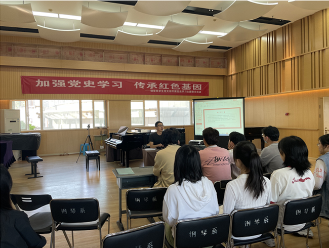 活动中,钢琴系学生党支部书记贾曦主讲,认真领学党的历史,全面宣传党的路线方针。