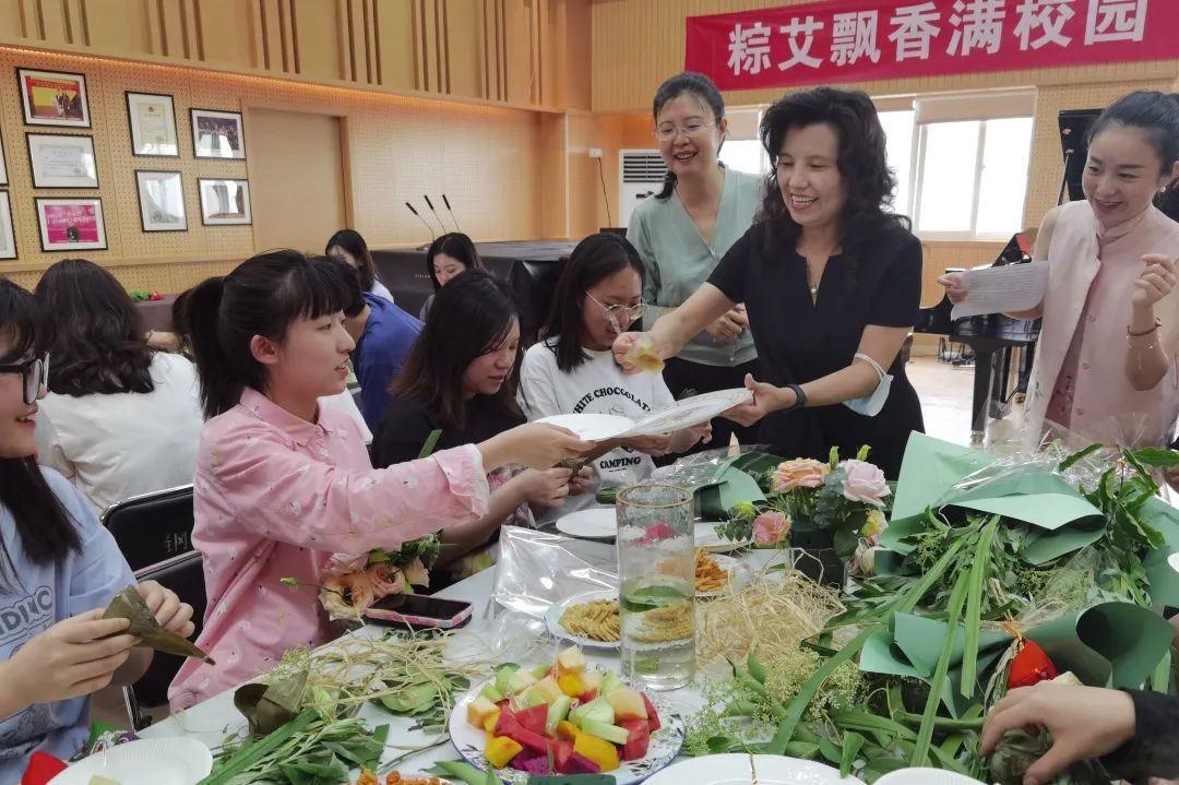 6月4日,学校党委书记文云英,党委常委、副院长王雁,党委常委、组织部部长、钢琴系党委书记刘芸秀,来到琴房大楼六楼排练厅,参加钢琴系精心准备的“粽艾飘香满校园、师生同乐话端午”活动,与钢琴系党政班子及教师代表、留校学生一起包艾草花束、品香粽,交流座谈,共度端午。在青年教师董珉君演奏《肖邦夜曲》的优美旋律中,文云英书记、王雁副院长亲手教同学们捆扎象征祈福的艾草花束,并为同学们送上了代表平安顺遂的祝福香囊。