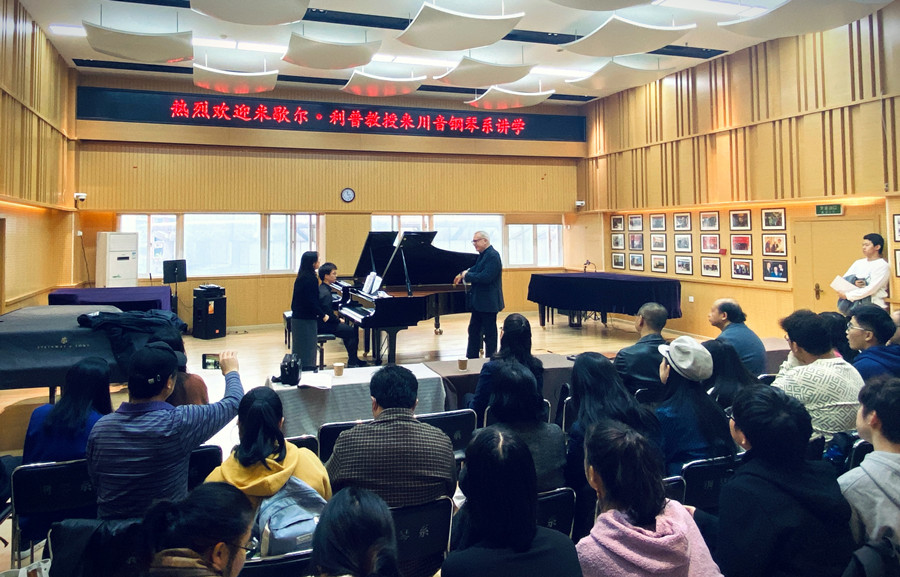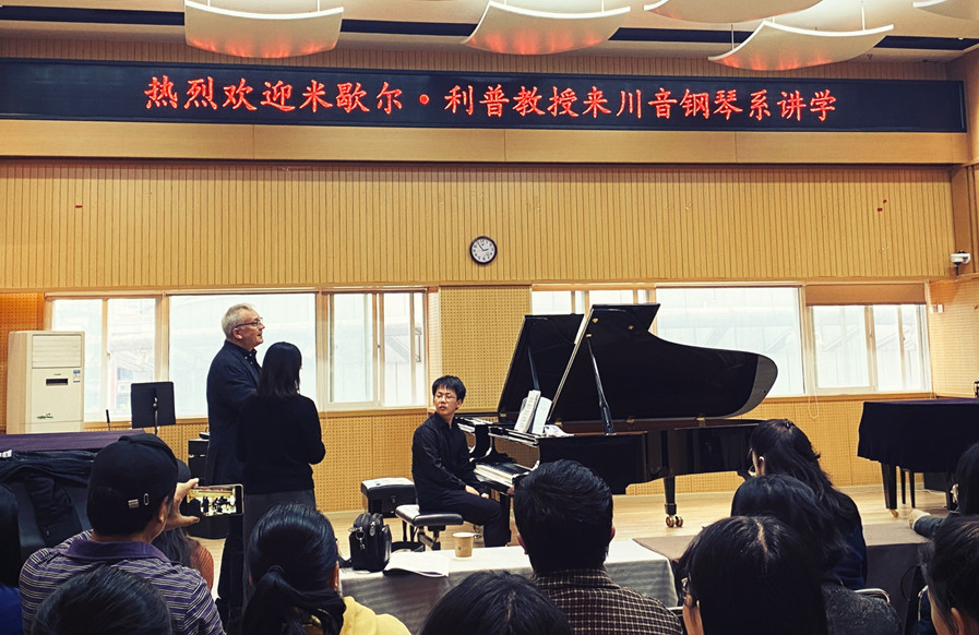11月13日下午大师课由维也纳国立音乐学院与表演艺术大学钢琴教育系的米歇尔·利普教授主讲,本次授课对象为2名钢琴系艺术附中学生。利普教授对上课曲目《贝多芬c小调32变奏曲》和《莫扎特降B大调奏鸣曲K.281》进行了非常详细的讲解,他强调应在演奏中表现出更多的音乐变化,以及用更丰富的音色表现作品细致的音乐特性。