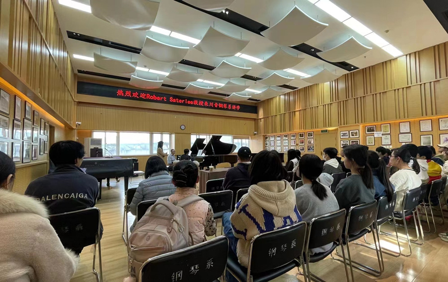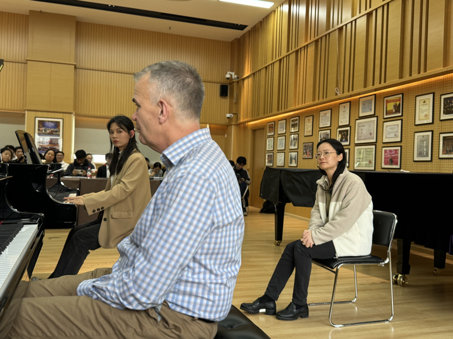 11月17日全天由美国博林格林州立大学钢琴系教授罗伯特·萨特里教授主讲,他聆听了学生们演奏的《德彪西欢乐岛》、《门德尔松幻想曲》、《斯克里雅宾第五钢琴奏鸣曲》、《雅纳切克奏鸣曲》等曲目,针对不同曲目的特性给出不同的演奏方法以及建议,并通过言传身教,示范曲目中的关键段落以帮助学生更好地理解作品。