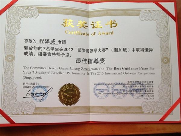 新加坡国际艺术节组委会于2013年7月26日-31日在新加坡举办“国际管弦乐艺术节”,特聘请管弦系程泽威教授为“新加坡国际管弦乐艺术节”艺术顾问及小提琴比赛评委,该艺术节包括专家专场音乐会、艺术交流、专家课、观摩及比赛等活动。在专家专场音乐会上,程泽威老师演奏了莫扎特小提琴奏鸣曲K.301,演出非常成功。在这次比赛中,川音学生也取得了很好的成绩,其中程泽威老师的本科学生杨海获得了比赛最高奖金奖,2012级研究生刘丹妮、本科二年纪学生胡鲲、附中三年级学生何星瑶、游璐均获得银奖。程泽威由此获得最佳教师指导奖。