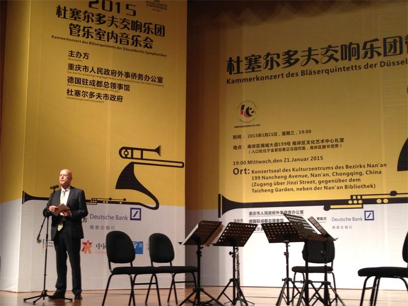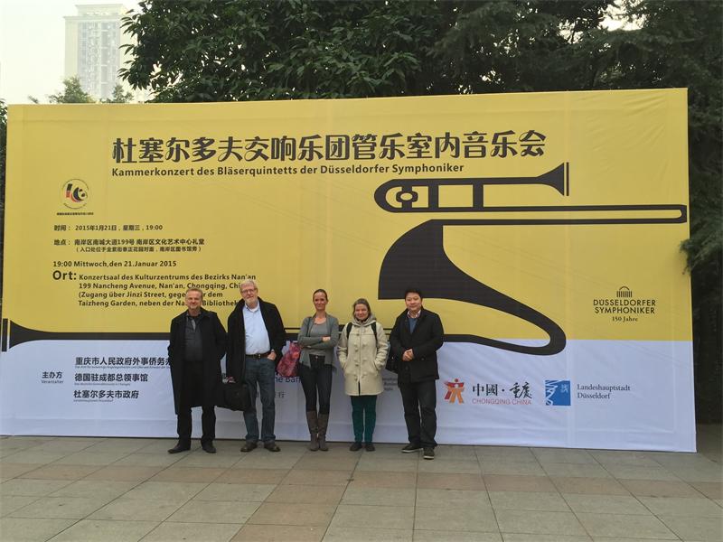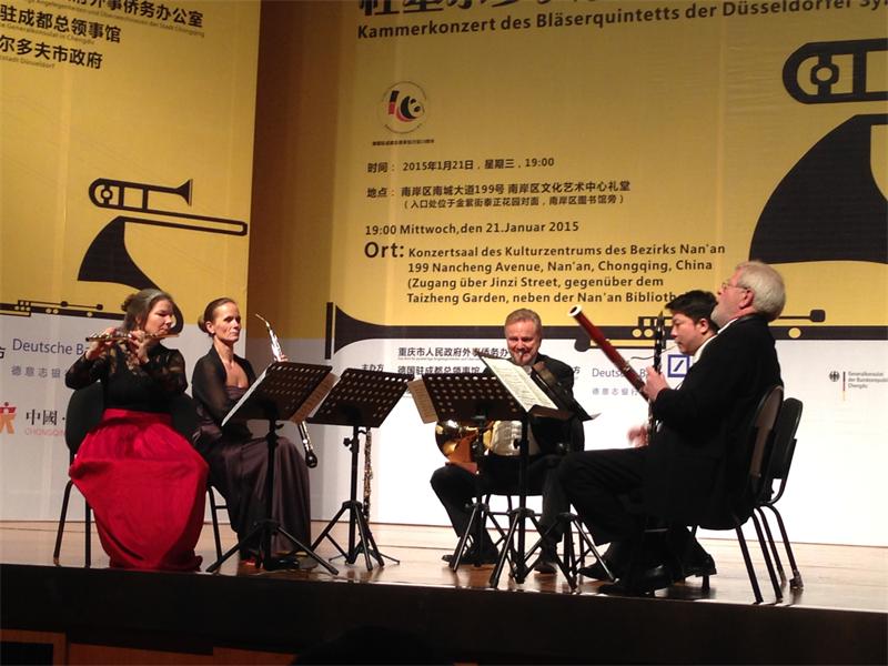 应德国杜塞尔多夫交响乐团行政总监Barbara Fasching女士邀请,我系巴松专业宋世彬副教授与来自杜塞尔多夫交响乐团的四位管乐首席演奏家,于2015年1月21日在重庆南岸区文化艺术中心举办了木管五重奏音乐会。该音乐会是在庆祝德国驻成都总领事馆开馆十周年、重庆和杜塞尔多夫缔结友好城市十周年庆典的背景下,由重庆市政府外事侨务办公室、德国驻成都总领事馆、德国杜塞尔多夫市政府共同主办的。 音乐会上演了尼尔森、莫扎特、米约、克鲁格哈特等学术性强、难度大的经典木管五重奏作品,并为观众加演了改编自我国著名交响乐作品《瑶族舞曲》的木管五重奏版,观众反响十分强烈。德国驻成都总领事,意大利、菲律宾等国驻重庆总领事以及重庆市政府外事办的领导出席了音乐会。