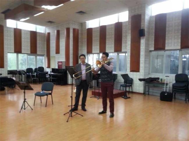 受我系邀请,2015年4月8日-9日,国家大剧院低音长号王炜老师的大师班圆满结束。 历时两天的大师班课程,王炜老师通过示范、引导及讲解让学生从不同的角度去理解演奏的技巧和感受音乐本身的魅力。学生参与度极高,也纷纷表示通过王炜老师细致耐心的引导式教学,使自己打开了不同思路拓宽了眼界。 同学们在两天的课程中热情参与练习与讨论,彼此间也不停交流心得,课堂气氛活跃和谐。学生们纷纷表示非常欢迎这种教学活动,可以让自己能从不同角度审视自己的学习。也希望学院可以邀请更多专家前来,使同学们可以开拓思路,丰富自己的世界, 同时也让川音通过交流向外传递我们一直禀陈的优良严谨的教学形象。