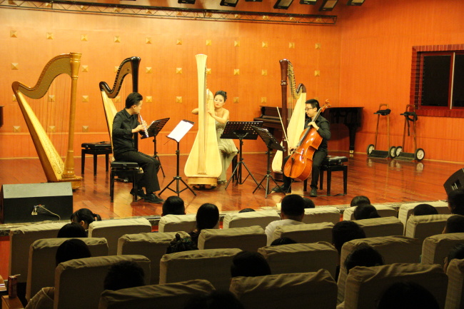 2015年6月2日,管弦系竖琴教师徐子珊在我院星海音乐厅,成功举办了由徐子珊本人领衔演奏的竖琴重奏音乐会。 竖琴对很多人来说是一个神秘的乐器,今晚的竖琴重奏音乐会便揭开了它的神秘面纱,将美妙动听的音乐完美展现给了观众。四台竖琴的重奏演奏形式,别具匠心,让人耳目一新,效果优美大气。 音乐会的开场,以大家耳熟能详的作品德彪西“随想曲”,由竖琴、长笛和大提琴合奏,这首作品的演奏给听众带来无限美感,旋律极其优美,演奏得恰到好处,是难得的佳作。其余所有作品皆由四台竖琴同时演奏完成,经典的有:巴赫“玛利亚”、门德尔松“歌声翅膀”、还有竖琴最著名的“卡农”等,徐子珊老师等人的精彩演绎将这些作品的音乐带进了观众内心,感受音乐之美。让观众领略到了竖琴纯正音乐的风采。 这次的竖琴重奏音乐会的成功演出,表明徐子珊在竖琴艺术的追求上,开拓思路,不断进取的精神,希望能继续创造出新的成就。