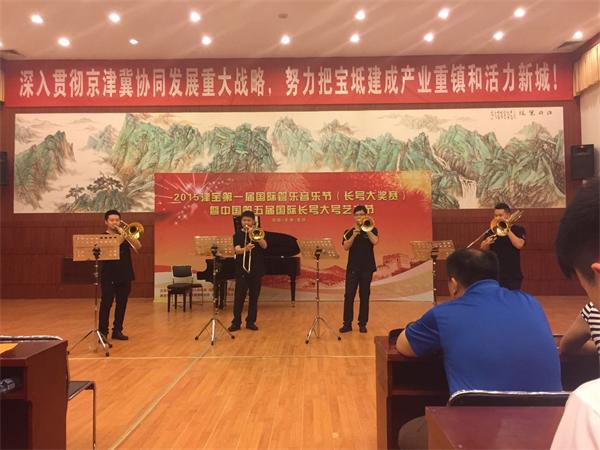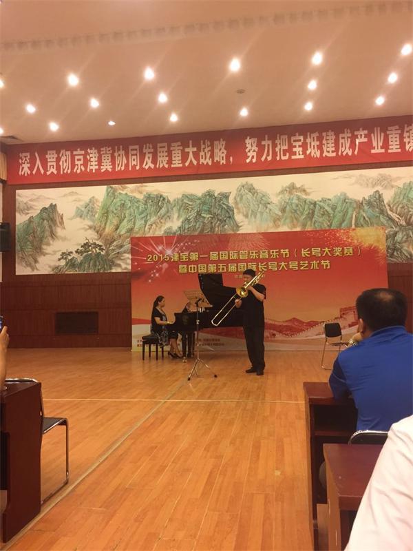 2015 年8月3号—8号伟德bv国际体育管弦系长号教师雷铭、黄晓凡、大号教师管世民,受中国长号大号联合会的邀请,赴天津参加第一届津宝国际音乐节(长号大奖赛)暨第五届国际长号大号艺术节。 参加艺术节期间三位老师积极与国际国内的众多知名长号大号演奏家教育家相互交流学习,观摩大师课和音乐会,受益匪浅。 在国内音乐学院的专场独奏重奏音乐会上代表伟德bv国际体育在音乐会上独奏长号协奏曲(雷铭)。压轴演奏三首长号四重奏(黄晓凡 雷铭 管世民 姜善雨 张涵睿)获得同行的赞誉。本科二年级学生张涵睿获得非职业成人组优秀演奏奖(指导老师雷铭)。在中国长号大号联合会的本次年会上雷铭当选为理事。为川音管弦系争得荣誉!