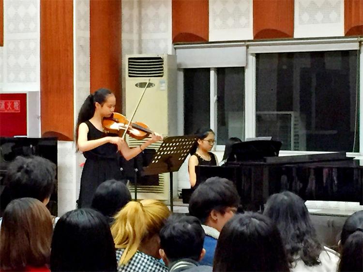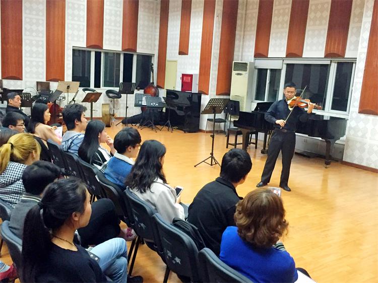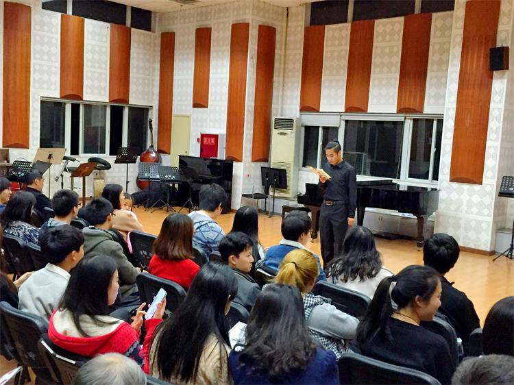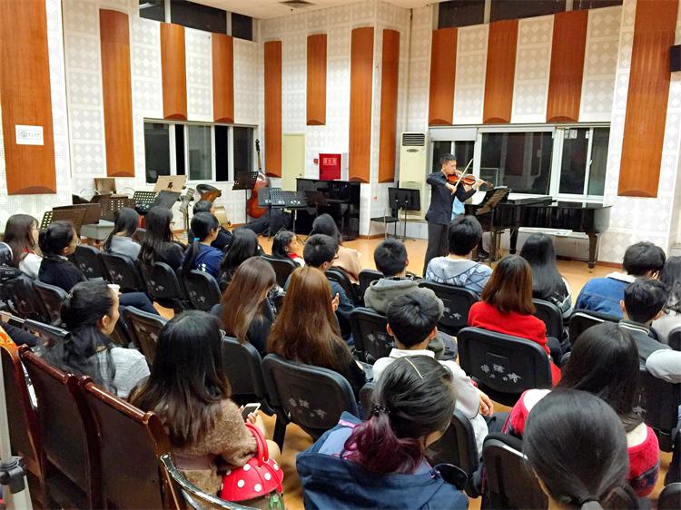 2015年11月10日,在这个初冬的夜里,第五届管弦系“弦乐之夜“音乐会在琴房大楼四楼排练厅开始了。主持人由90后的学生张哲敏担任,虽然准备了完整的开场白,但初次登台的他还有一点紧张,坐在位子上的的同学们为他捏了一把汗,轻声的在台下鼓励着:“声音再大一点”。 音乐会就在期待和焦急等待中开始了,第一个上场的是黄立俊同学,调整了一下自己的衬衣之后开始演奏了,看的出来准备的很充分,场上算得上是气定神闲,让场下同学躁动的心顿时安静了下来,15分钟格里格表现的算是很稳定的,获得了老师的一致好评,我系小提琴老师青彦言在他下场的时候向他竖起了大拇指。 音乐会在继续,黄首力、李嘉云滔、应颖佳、杨湿埼等同学陆续上场,场下的指导老师们看起来比学生还紧张,家长们忙着为学生拍照,场外还徘徊着正在调音等着上场的同学,场内场外的气氛一样紧张。 最后压轴上场的是管弦系的青年老师罗乐,比起学生来,罗老师更多了一份自信,巴哈能让人的心绪沉淀下来,罗老师场上的演奏也赢得了现场同学的一致掌声,更为本场音乐会画上了一个完美的句点。 初冬的夜有一点冷,但是我们的四排厅却无比的暖和,和着音乐的气息和青春的气息。本届“弦乐之夜”音乐取得圆满成功。