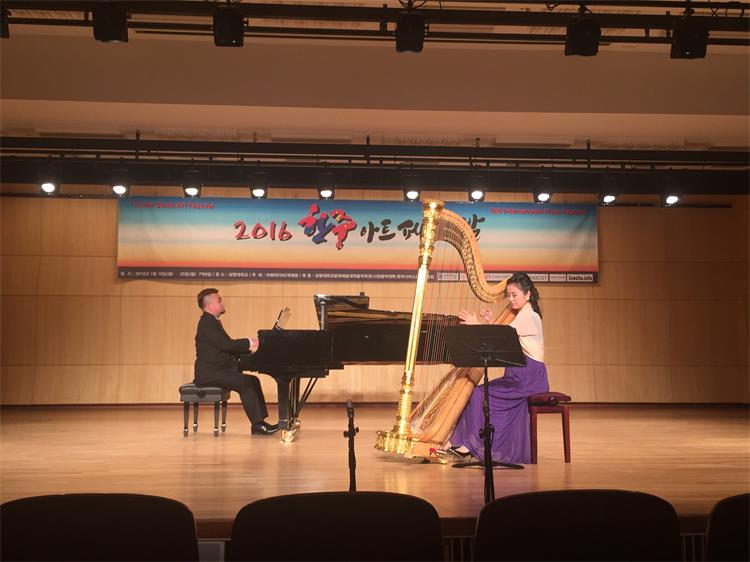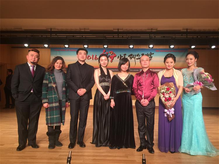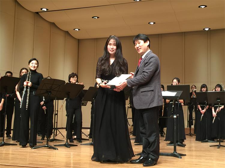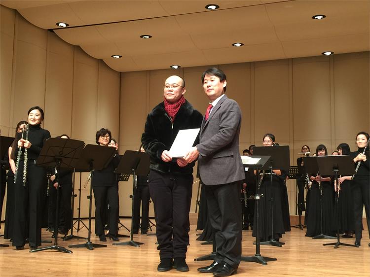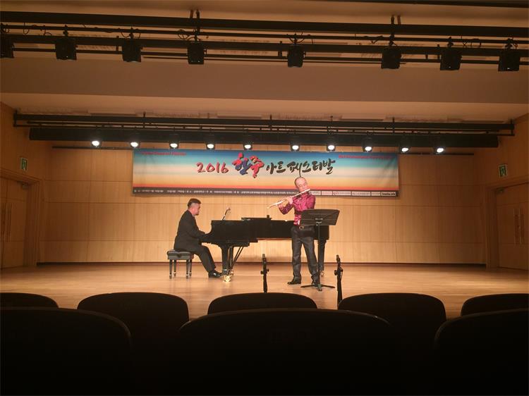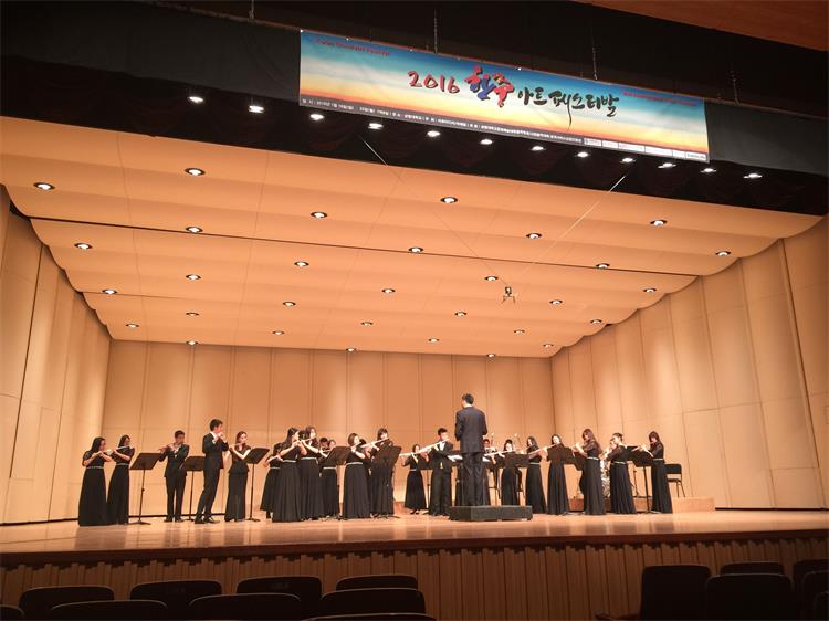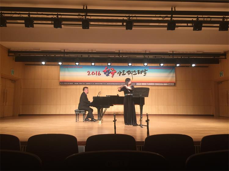 2016年1月18日-25日,由我系长笛副教授徐静平带队,长笛教师曾怡、段雯洁、竖琴教师徐子珊、钢琴艺术指导张玥、中提琴副教授雷楠、指挥杨瑞峰和长笛专业35名学生一道赴韩国参加中韩国际艺术交流节活动。 在活动期间,学生们每日在韩国祥明大学上大师课,与韩国艺术家进行零距离交流和学习,我们的专业老师也在韩国进行了艺术座谈,为促进中韩艺术文化交流起到了积极作用,也为伟德官网日后与祥明大学的进一步文化艺术交流合作打下了坚实基础。最后,我系专业老师们和同学们在音乐厅分别进行了精彩的演出,观众反响热烈,徐静平副教授被授予中韩文化艺术大使称号,每位同学也领取了他们的大师课和演出的证书。 此次活动,遭遇了韩国十年难遇的极寒天气,同学们不畏天气严寒,每日认真虚心学习,刻苦练习,不管是单独的演出还是和韩国祥明大学的长笛乐团的合作演出,都展示了实力,交出了一份精彩的答卷。我系每位专业老师的独奏演出更是精妙绝伦,观众们掌声雷动,送给每位台上的艺术家们。通过这次活动,同学们开阔了眼界,增长了见识,在国际舞台上秀出了实力,今后,我系会进一步开展此类活动,为文化艺术交流和专业的进一步提升做出自己的贡献和力量。