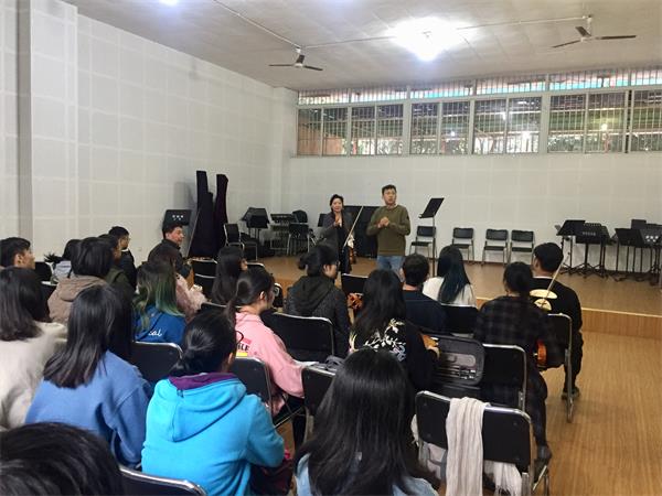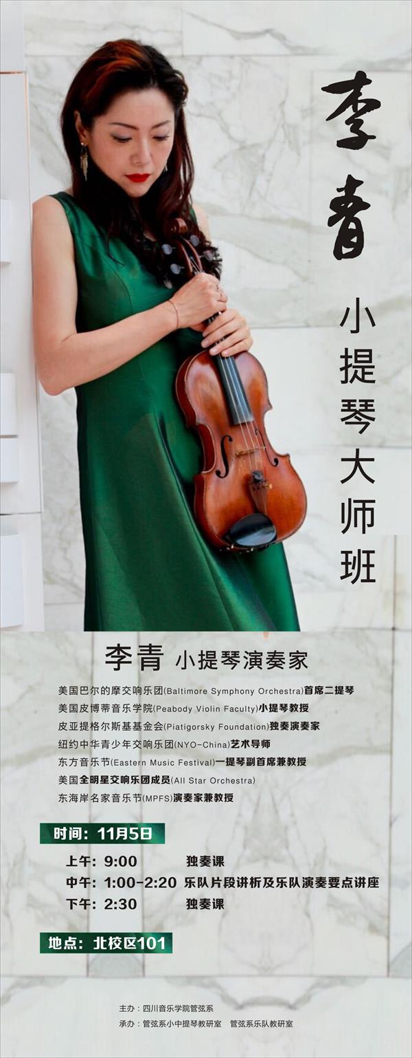 受我系邀请,小提琴演奏家美国巴尔的摩交响乐团(Baltimore Symphony Orchestra) 首席二提琴,美国皮博蒂音乐学院(Peabody Violin Faculty)小提琴教授李青教授于11月5日为我系小提琴专业的同学们举办大师班。 李青教授为同学们细致地讲解了在独奏演奏中应根据和声色彩的变化调整演奏风格和演奏技法,同时为大家讲解了乐队片段演奏的重点和难点,建议同学们多看总谱,多听乐队声部的变化。 李青教授大师班获得圆满成功!同学们对独奏和乐队演奏技法有了更深入的学习,获益匪浅。