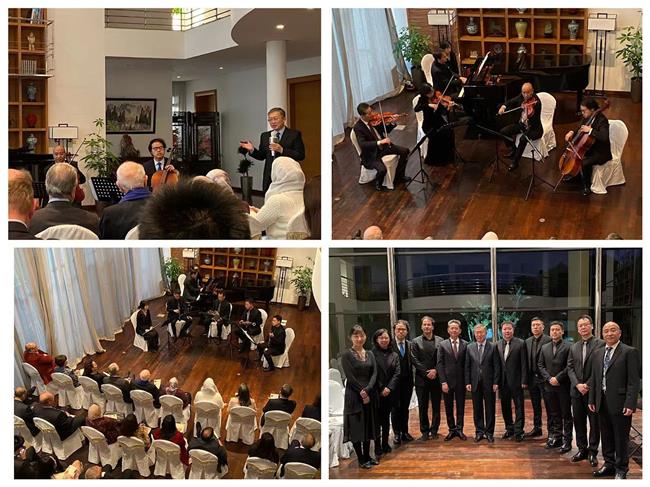 12月8日下午,伟德bv国际体育重奏团应中华人民共和国驻摩洛哥特命全权大使李立夫妇邀请,与摩洛哥著名钢琴家马如安(Marouan Benabdallah)跨国合作,在大使官邸举办音乐沙龙,共同献上了一场精致高雅的室内乐音乐会。摩洛哥国王文化顾问安德烈·阿祖莱、政府秘书长穆罕默德·哈吉维、参议院副主席阿卜杜拉哈米德·苏利、外交部办公厅主任萨米·马拉奇、文化青年和体育部秘书长阿布德拉·阿菲菲、首相夫人哈利玛·萨顾尔等摩洛哥高层政要,以及芬兰、匈牙利、日本驻摩大使等外交使节近40人出席。音乐会上先后演奏了舒曼的《钢琴与弦乐五重奏Op.44》和普朗克的《钢琴与木管六重奏》,时而激昂、时而深沉的高水平演奏形成巨大的感染力,赢得了在场观众的热烈掌声。返场环节,音乐家们特意演奏了一曲中国作品《边陲速写:火把节的一个角落》,将现场气氛推向了高潮。