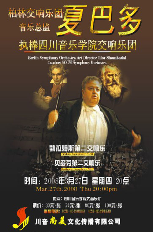 柏林交响乐团音乐总监夏巴多执棒川音交响乐团 时间:2008年3月27日晚8点 地点:伟德bv国际体育音乐厅 曲目:贝多芬第二交响乐 勃拉姆斯第二交响乐 客座指挥:柏林交响乐团音乐总监:夏巴多