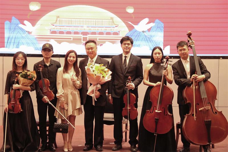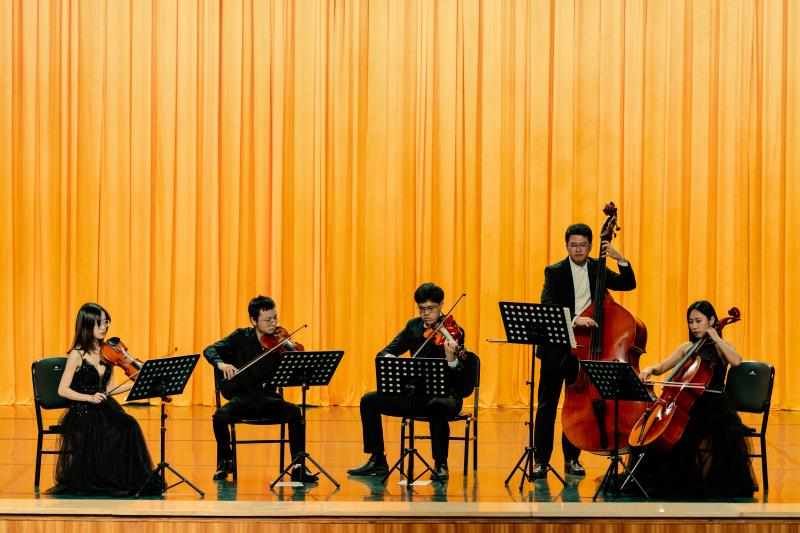 为迎接建党100周年,音乐会的前两首曲目《唱支山歌给党听》和《祖国,慈祥的母亲》均改编自红色歌曲,以室内乐的方式进行演出更显得色彩浓郁,在室内乐音乐会中不可多见,显得尤为可贵。紧接着,精巧的节奏、突出的重音和低音提琴的拨弦将风格转变到探戈,青年演奏家们带来的《一步之遥》选自电影《闻香识女人》,是一首非常经典的室内乐曲目,将听众置身于电影当中。