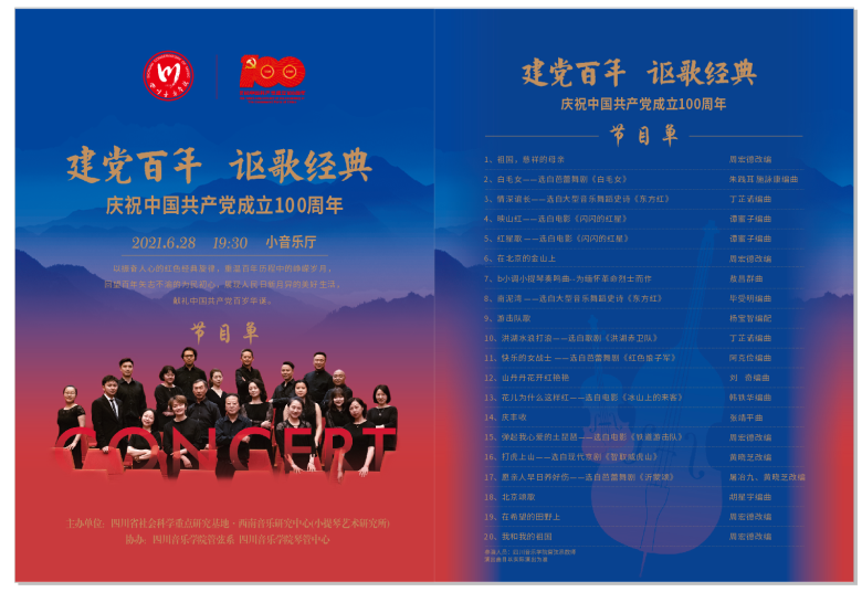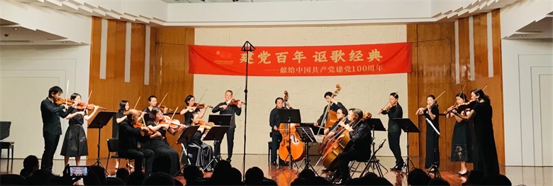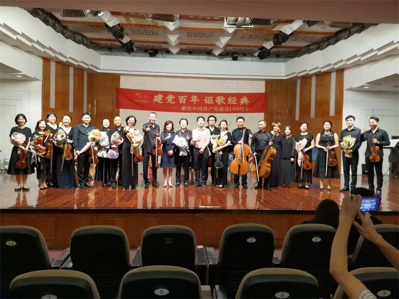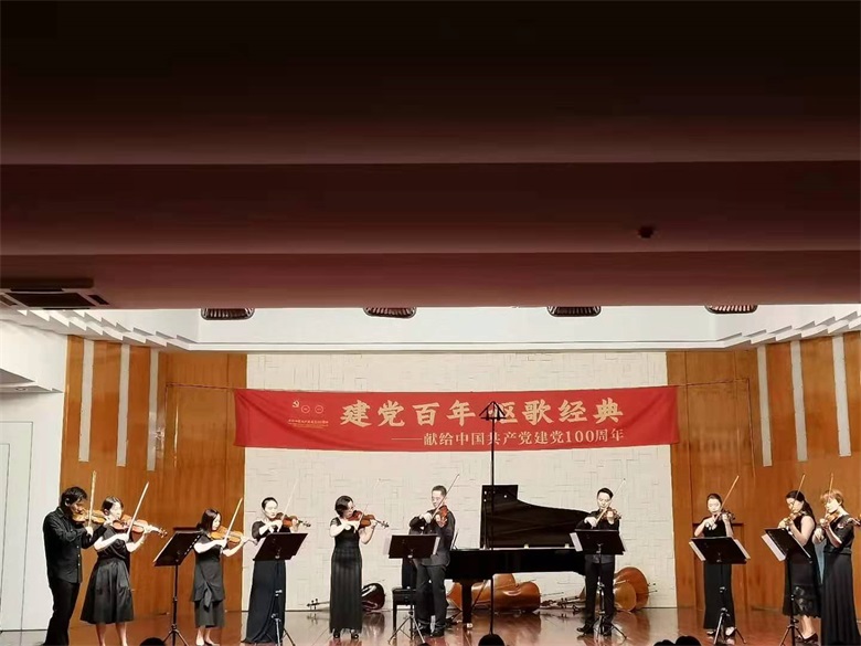 6月28日,在西南音乐研究中心(小提琴研究所)、管弦系的主办下,管弦系书记、主任蔡宇教授、李开祥教授、程泽威教授、杨云教授、李倩副教授等20位教师在小音乐厅为中国共产党成立100周年献上了一台经典中国弦乐作品。