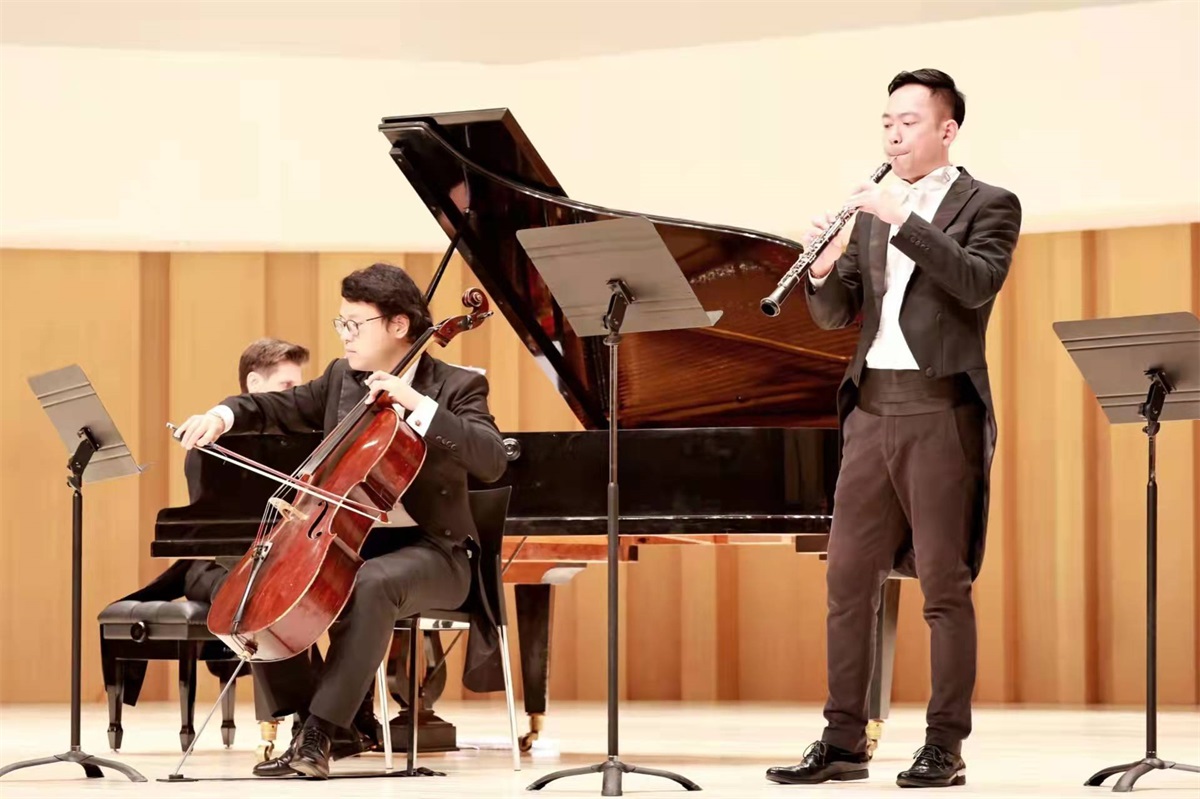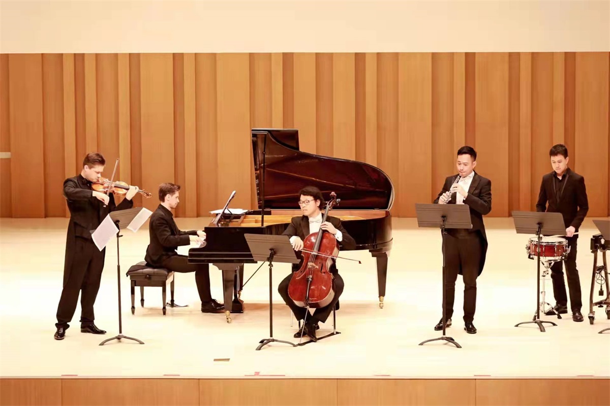 12月7日,为庆祝中国和奥地利建交50周年,2021成都·欧洲文化季——中奥秋季音乐会在中国-欧洲中心上演。音乐会由成都市人民政府外事办公室、奥地利驻成都总领事馆主办,成都高新区新经济发展局、成都高新区国际合作投服局承办。 音乐会由我系鞠兴、赵明玮两位老师与现代器乐系莫翰音老师,以及来自成都大学中国-东盟艺术学院的奥地利青年小提琴家Tymur Melnyk、钢琴家Patrick Lechner联袂献上。