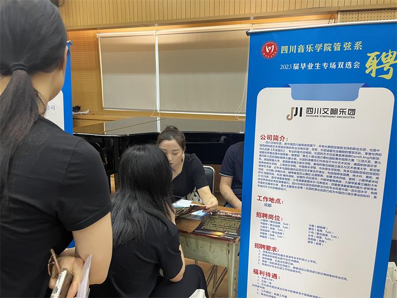 为深入学习贯彻党的二十大精神,落实党中央、国务院“稳就业”“保就业”决策部署,抢抓春季开学后促就业工作关键期,强力促进管弦系毕业生充分高质量就业,按照学校相关工作要求,管弦系毕业生就业工作专班在广泛访企拓岗、校外实习就业基地共建等工作的基础上,于4月19日下午在琴房大楼四楼排练厅成功举办“访企引岗促就业—管弦系2023届毕业生专场双选会”。四川交响乐团、成都市青少年宫、四川壹现场文化传播有限公司/中演现场(成都)文旅发展有限公司、首席猫艺术培训学校、北京中福音文化艺术中心、成都意林乐器有限公司、成都尔闻艺术、赞诚教育信息咨询有限公司、成都市武侯区馨铃艺术培训学校共九家用人单位相关负责人受邀参加了本次专场双选会。