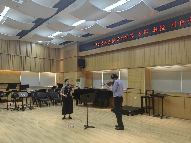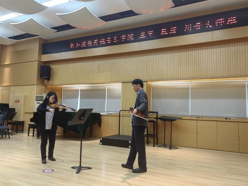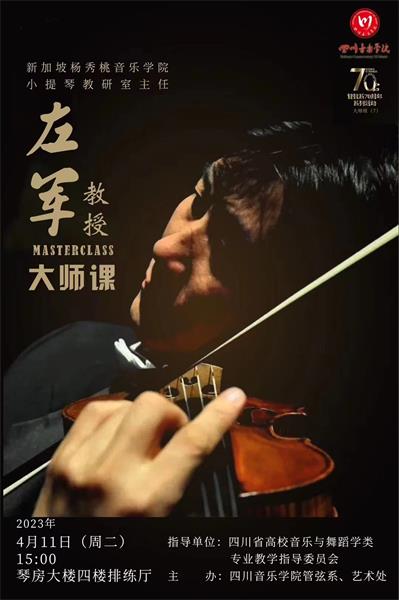 2023年4月11日,由川音管弦系、艺术处主办的新加坡杨秀桃音乐学院左军教授川音大师班在琴房大楼四楼排练厅圆满举行,我系师生积极参与并从中获益良多。大师课上我系两名青年教师徐敏嘉及王钰分别演奏了巴赫无伴奏第二奏鸣曲庄板、行板、快板、帕格尼尼随想曲第15课、以及莫扎特第四协奏曲一乐章。左老师对不同的作品提出了简明扼要的建议,使音乐在短时间内变得更加精彩流畅。从如何使用指法帮助音乐表达到构建乐曲大方向的框架,左军教授亲切的的指导与精彩的示范演奏使我系师生受益匪浅,反响热烈。