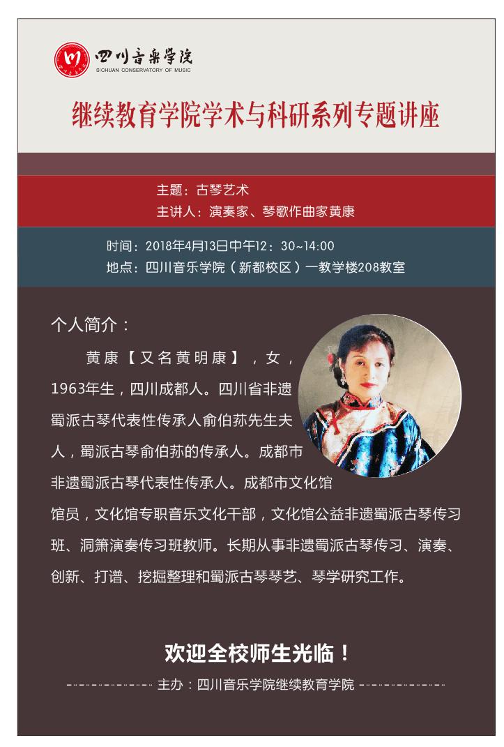 在本周五12:30—14:00在伟德bv国际体育(新都校区)一教学楼208教室开展“古琴艺术”专题讲座。