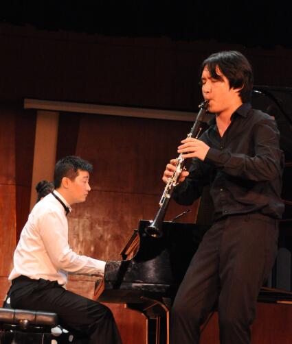 2016年6月20日晚,在伟德bv国际体育新都校区演艺厅举行了蔡毅教学班师生音乐会,此次音乐会特邀旅欧青年单簧管演奏家黄宇清先生。演出曲目包括莫扎特单簧管协奏曲和德彪西的四手联弹以及很多高难度的钢琴独奏曲目。在音乐会中由蔡毅老师和黄宇清先生协奏的莫扎特单簧管协奏曲,时而热情洋溢,时而安静舒缓,时而俏皮灵动,充分体现了莫扎特的音乐特色。蔡老师和专科部尖子生刘宇柳演奏的德彪西四手联弹小组曲音色变幻丰富,节奏韵律把握到位,为观众带来了很好的艺术享受,也为同学们如何演奏室内乐以及如何与同行配合玩音乐做出了示范。