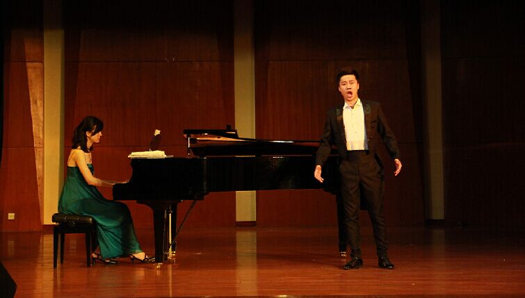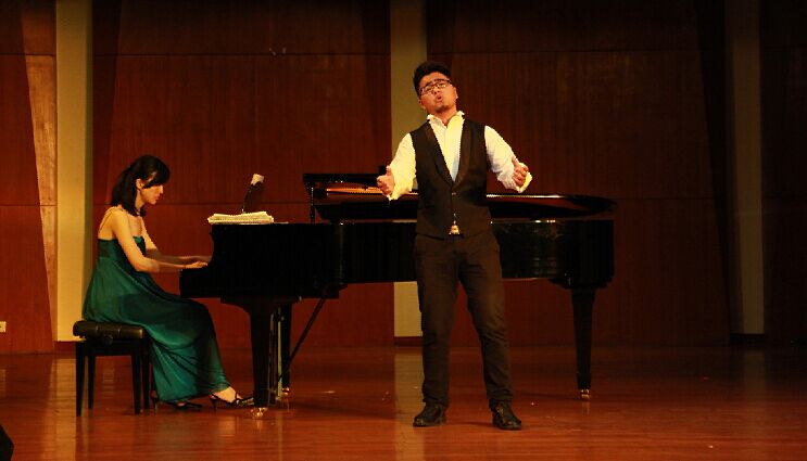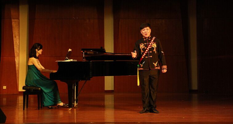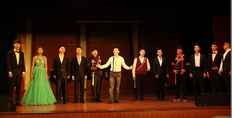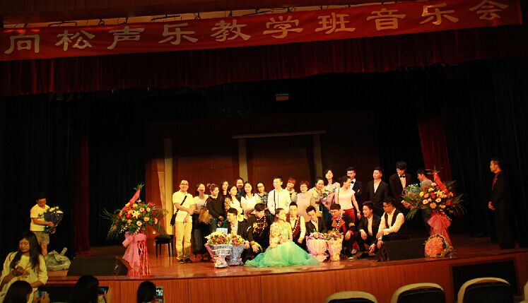 2015年5月21日14:30分,在我院新都校区小音乐厅举办了向松教学班音乐会,音乐会演出成员由向松老师及其学生组成。学院很多专业老师及同学参加了音乐会。     音乐会由向松老师的三位彝族同学带来的一首彝族歌曲《凉山酒歌》拉开序幕,活跃了音乐会的气氛。接下来是吴鹏宇同学演唱的《教我如何不想她》这首歌是中国早期广为流传的重要诗篇,吴鹏宇同学也通过他的演唱表达出了他对于这首歌的理解。然后是蔡森同学演唱的《乡谣》,《乡谣》是中国民族歌剧作品《野火春风斗古城》中的经典片段。听着歌曲,似乎也勾起大家对于家乡的共鸣,大家给予了热烈的掌声。接下来还有阿木静富带来的《草原之夜》、唐浪的《妈妈的生日》等等作品。银志林同学演唱的一首东北民歌《乌苏里船歌》也表达出了北方民族过上幸福生活,欢快,心情格外开朗的感觉。接下来是龙泳潭同学带来的《一切就在转眼之间》和《暗香》,其中《暗香》的表演方式给人眼前一亮的感觉,他用美声的演唱方式翻唱了这样一首大家都知晓的通俗歌曲,也得到了大家的热烈掌声。最后是向松老师和所有参见演出的同学给大家带来的《草原上升起不落的太阳》,祝愿所有观众以后的生活蒸蒸日上,红红火火。     音乐会在观众的热烈掌声中结束了,最后老师们都上台与全体演出人员合影留念。与此同时,一些同学也准备了鲜花送给向老师表达自己对老师的感谢之情。