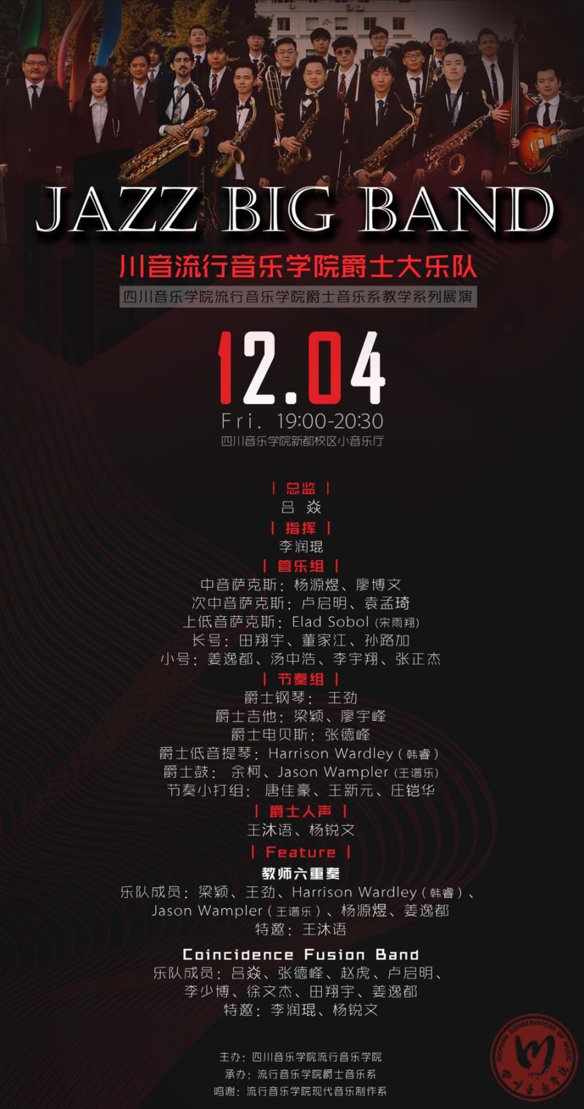 本次展演活动的三场演出分别为:获得“爵士高手 乐坛争霸”爵士乐大赛乐队组一等奖的“Déjà vu(既视感)乐队”的音乐会、由爵士音乐系2019级、2018级、2017级优秀学生乐队与合奏课老师们共同精心排练的一场高质量的音乐会、由川音流行音乐学院爵士大乐队带来的精彩绝伦的爵士大乐队音乐会。