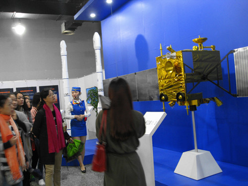 本次展览共展出20多组航天实物模型,这些模型包含的让世界瞩目,令国人骄傲的中国航天技术成果,是我国航空航天史的座座丰碑。包括第一个丰碑人造卫星、第二个丰碑载人航天、第三个丰碑月球探测器,嫦娥三号的着陆器。其中“玉兔号”月球车、长征火箭、人造卫星、模拟发射场和遥控月球车都有精彩呈现。展览还专门设计了科普互动体验区,观众可模拟操控“玉兔号”月球车在“月面”行走,体验在月球以及太阳系各大行星上的不同体重变化。还可观看嫦娥一号到三号的发射及全程轨迹演示等。此外,还展示了一批以月亮为主题的艺术作品,包括书法、绘画、雕塑、陶瓷等。大家通过触摸、听声、观看三D电影、操作等多种视听和体验,充分感知了高科技的魅力。
