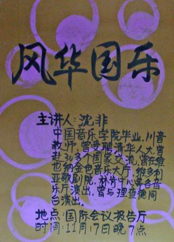 应西南财经大学邀请,我院民乐系中阮专业教师沈非于2008年11月17日晚7点半,在西南财经大学国际会议报告厅举行了《风华国乐》之阮的历史与发展的学术讲座,到会同学反响热烈,且现场气氛相当活跃。 讲座的内容主要分三个部分: 一、阮的历史。 1、阮的起源。 2、历史上的兴盛与衰弱。 二、阮的现状。 1、50年代的再次兴起。 2、介绍七、八十年代的特征,改编作品。 现场有郭茜演奏《云雀》。 贾瑞芝演奏《火把节之夜》。 3、介绍80年代的创作作品。 现场有郭茜演奏《悠远的歌声》。 4、介绍作曲家及中阮演奏家刘星、以及中阮第一首协奏曲《云南回忆》。 三、阮的发展。 1、介绍阮与New age音乐,播放录像《闲云孤鹤》。 2、介绍阮的高难度作品,播放《孤芳自赏》、《山歌》。 3、介绍阮与其它乐器合作的现代作品,播放《周二聚会》。 4、介绍阮的重奏作品,播放《异想天开》、《舞蹈》。 5、介绍阮族乐团的形成,以及将来的发展。 注:现场播放的所有录像资料均为沈非与刘星老师的现场演奏。 到场同学的热情完全超出了想象、非常踊跃地与老师进行互动,非常勇敢且大胆地阐述自己的观念,与老师进行交流,讲座完毕后,仍有很多同学聚在老师周围,问着各式各样的问题,并希望在下一年的音乐节中继续听到老师的讲座。