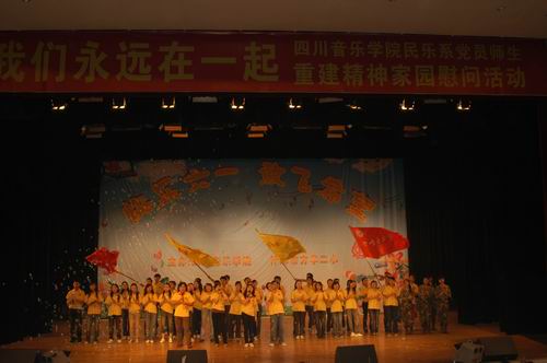 “5•12”地震发生已经一周年了,自地震发生的那天起,川音人的目光就一直未曾离开过灾区群众,时刻心系灾区人民,更热切的关注着灾区同学们的学习和成长。端午佳节和“六.一”儿童节来临之际,2009年5月26日,民乐系党员师生、学生干部一行60余人,在什邡中学礼堂举行了以弘扬伟大抗震救灾精神,重建美好精神家园为主题的科学发展观学习实践活动。出发前,我院党委书记柴永柏教授亲专程与慰问团合影并鼓励大家要团结一心,众志成城,向灾区人民伸出我们的援助之手,献上一台精彩的演出,为灾区精神家园建设做出应有的贡献。