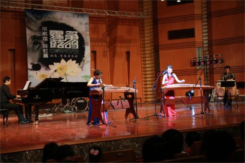 音乐会以一首《锋云》开场,此曲改编自热门游戏“三国杀”中的配乐,以竹笛与电声的协作营造出一种时尚新颖的氛围,使人眼前一亮,也预示着这将是一场精心设计,与众不同的视听盛会。随后的一曲《枫桥夜泊》,宋俞霆以精致婉约、细腻生动的音乐语言描绘出夜泊枫桥使人对“江枫渔火”的回念与思叹。而陈虹蕗则是以娴熟的技巧和洒脱奔放的演奏,诠释“此时无境若有境,此时无声胜有声”的音乐最高境界——《无境》。音乐会上半场结束曲《热情蔷薇》由一台多声筝和一台低音筝与钢琴、打击乐合作完成,旋律跳跃生动,两位演奏者律动十足的演绎深深地吸引了观众,带动了现场气氛,使现场的气氛掀起了一次小的高潮。