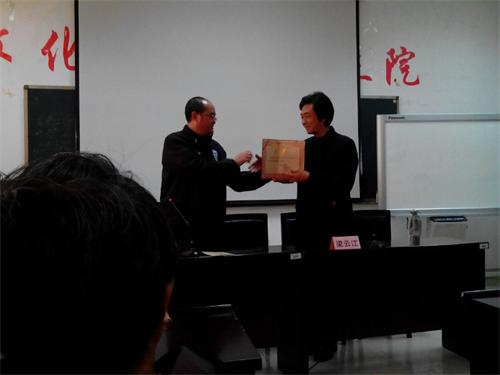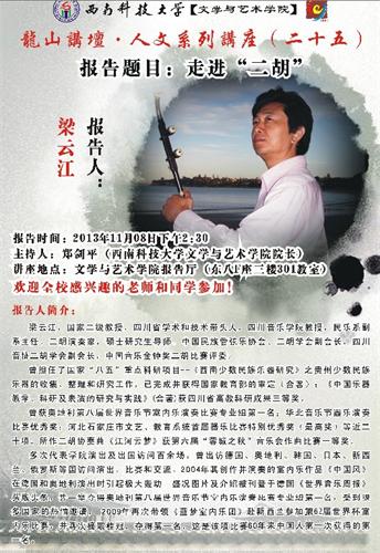 2013年11月8日下午,西南科技大学文学与艺术学院学术报告厅座无虚席,应该大学邀请,伟德bv国际体育民乐系梁云江教授专程赴绵阳为西南科技大的师生作了《走进二胡》专题学术讲座,并举行了二胡大师课,这是该校“龙山讲坛•人文系列讲座”的重要内容之一。梁教授由浅入深、用生动丰富的语言向广大师生讲述了“怎样欣赏二胡音乐”“怎样练琴”。从声音到内容,从弦律到感受,一步步引导人们走进二胡的美好音乐中。在场的两百多名听众有该校的师生、有绵阳市的音乐工作者、还有专程从三台江油等地慕名赶来的外地二胡和音乐爱好者。大家无声无息、认真地听着讲解,许多人还记着笔记,梁教授风趣幽默而丰富的语言深深感染着听众,现场不时爆发出欢快的笑声和热烈的掌声。 讲座后,梁教授现场亲自演奏和指导文艺学院的学生,使大家又一次感受了二胡的魅力,在长达两个半小时的活动中,大家始终情绪饱满,气氛热烈,对于现场提出的各种问题,梁教授一一作了解答,获得大家热烈的掌声和好评。 随后,梁云江教授被聘为西南科技大学艺术学科兼职教授,由该校文艺学院院长为梁教授颁发了聘书。