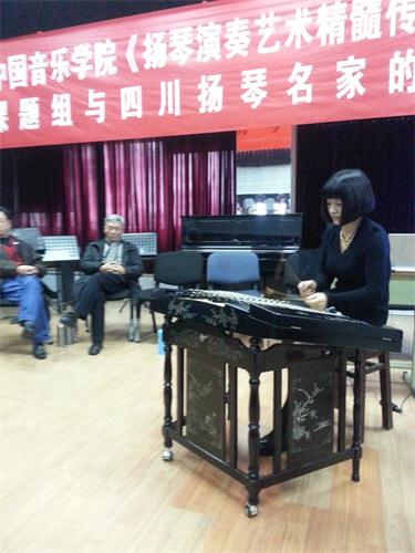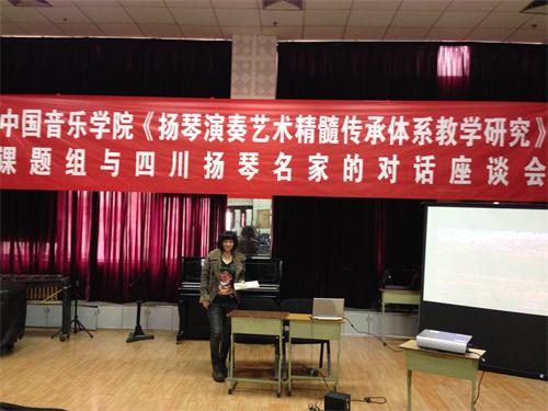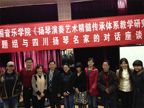 2013年12月11日,中国音乐学院《扬琴演奏艺术精髓传承教学体系 研究》课题小组赴成都采风,对四川扬琴传统音乐进行学习调研。川音院领导及民乐系对此次交流活动给予了大力支持,在民乐系王英教授的协调与努力下,课题小组在我院民乐系进行了为期五天的调研及学术交流活动。