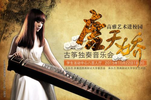 青年古筝演奏家唐天娇将在西南财经大学举办“高雅艺术进校园—-唐天娇古筝独奏音乐会”,将为校园带来一场古筝音乐会盛宴! 现任伟德bv国际体育古筝专业老师,伟德bv国际体育民族管弦乐首席古筝演奏家,中国音乐家协会古筝协会会员、中国民族管弦乐学会古筝专业委员会会员、四川音乐家协会会员;曾荣获文化部政府最高演奏奖弹拔乐【文华奖】并荣获众多国际国内金银奖项。被中国新闻网、人民网、新华网、大渝网、泸州新闻网、成都商报、重庆商报相继报道。   2011年11月由共青团中央主管,中华全国青年联合会出版中华儿女海外版《魅力中国》城市版第395期刊登为内页封面【关注人物】“唐天娇——与筝俱来的美”。   2012年7月由中国国家级音乐类专业刊物,《中国乐坛》杂志社海内外发行总第34期,刊登为中国乐坛封面【乐坛人物】“唐天娇艺术风采”。   2015年3月由中共重庆市委宣传部、重庆市人民政府新闻办公室、重庆市人民政府外事侨务办公室、重庆市对外贸易经济委员会联合主办;重庆广播电视集团、重庆日报报业集团承办的全媒体大型人物故事寻访第15期【逐梦他乡重庆人】。 本场音乐会由共青团西南财经大学委员会主办,西南财经大学学生艺术团承办,在西南财经大学学生活动中心于2015年10月22日18:30分演出。 届时还邀请财大学子共同演绎,共同打造中国梦。