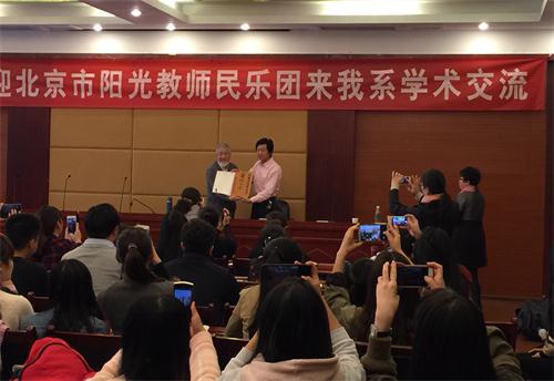 这次讲座最大的亮点是梁教授边给大家讲解,边亲自操琴给大家 10月28日上午,民乐系同北京阳光教师民乐团在梧桐楼进行了学术交流。示范演奏《江河云梦》全曲,通过依次逐句的示范和讲解,让大家能更直观地理解乐曲,了解在练习过程中要注意的技巧重点,困难乐句和音乐的处理,教授高超精湛的演奏技艺博得了全场师生和北京的老师们极为热烈的掌声。