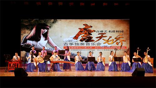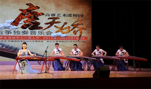 2015年10月22日晚,“高雅艺术进校园—唐天娇古筝独奏音乐会”,在共青团西南财经大学委员会主办下顺利进行。 音乐会以一首古筝协奏曲《战台风》拉开了帷幕。此曲气势磅礴,音乐形象鲜明,成功地塑造了码头工人大无畏的精神和压倒一切困难的英雄气概。 音乐会还特邀了西财学生艺术团演奏《采花》,多种乐器合奏,将一片热闹繁华之景渲染得淋漓尽致。 唐天娇与带领西南学子演奏《雪山春晓》,师生们的倾情演绎,将西藏人民舒袖歌舞的热闹欢腾之景一一展现,体现了人们对新生活的美好追求,引起现场观众的共鸣。 整场音乐会展现出很强的艺术性和技术性,并以准确的情感把握、优雅流畅的旋律、清新多变的格调牵动着观众的心弦, 唐天娇给西财师生献上了一场高雅艺术的饕餮盛宴,使广大师生从中领悟到了中国民族音乐的无限魅力,给本场音乐会画上了圆满的句号。