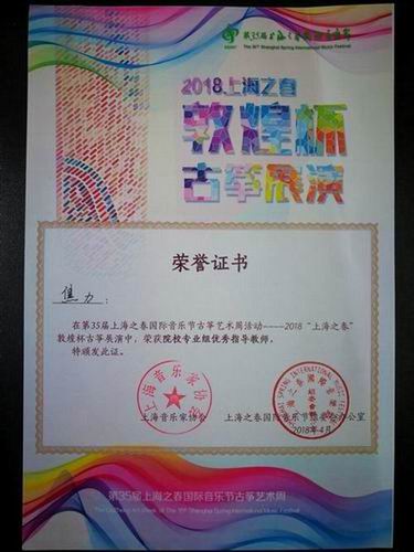 2018“上海之春”敦煌杯古筝展演中,我系附中高二古筝专业学生焦麒睿荣获专业少年组最高奖