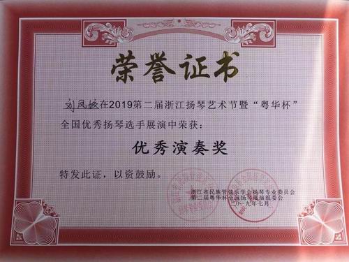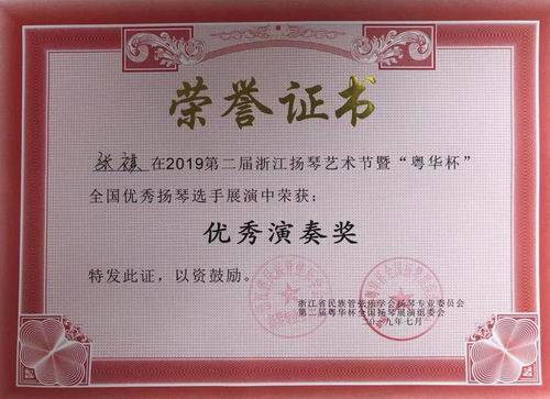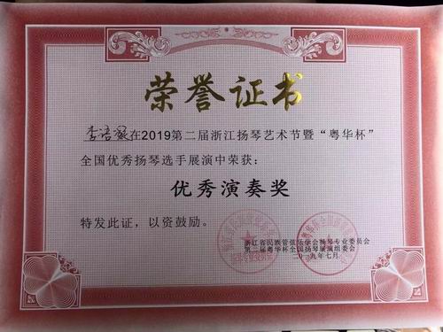 2019年7月20-24日,李雪梅老师携学生到浙江乐清参加第二届浙江扬琴艺术节。 为迎接2019建国七十周年,第二届浙江扬琴艺术节将在浙江省温州市乐清市举办。关心扬琴领域的诸多演奏家、教育家、作曲家、理论家将亲临盛会。 本届艺术节由浙江民族管弦乐学会主办,浙江音乐学院国乐系、浙江省民族管弦乐学会扬琴专业委员会协办,华音网承办,力争将本届艺术节办成一个有水准、有特色、有品质的音乐盛会。 7月22日晚,李雪梅老师本三学生李语凝 陈艺丹有幸受邀参加当晚音乐会,弹奏《雪花与回忆》。 此次艺术节中,李雪梅老师团队获得优异成绩如下: 独奏铜奖1名:陈艺丹, 优秀奖3名:李语凝 刘凤娇 张祺, 重奏组铜奖:李语凝 陈艺丹《雪花与回忆》