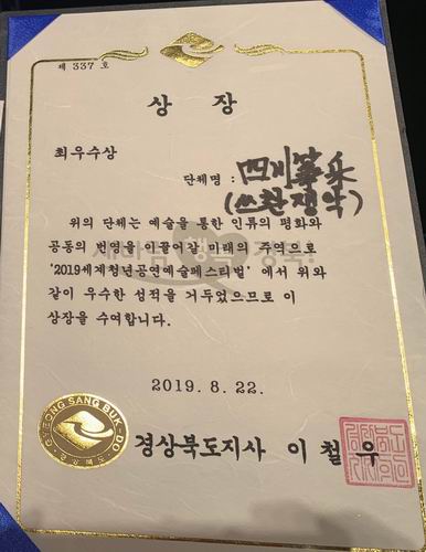 2019年8月20日至8月22日,“2019世界青年演出艺术节”在韩国举行。伟德bv国际体育天籁筝乐团携手四川音乐家协会古筝学会、成育艺术中心联合代表的“四川筝乐”(以下简称“四川筝乐”)受邀参与此次艺术展演活动。在历时三天的激烈角逐中,“四川筝乐”脱颖而出,顺利进入总决赛并获得最高奖项。 本次活动由한국예총경상북도연합회主办,경상도 안동시赞助,共计26个音乐团体参加,聚集了世界各地优秀艺术团体与音乐人才,汇集了世界各地独具特色的音乐艺术以及展现了艺术的多样性和包容性,是一场国际化的艺术盛宴。 再次祝贺伟德bv国际体育天籁筝乐团在“2019世界青年演出艺术节”中喜获最高奖项!