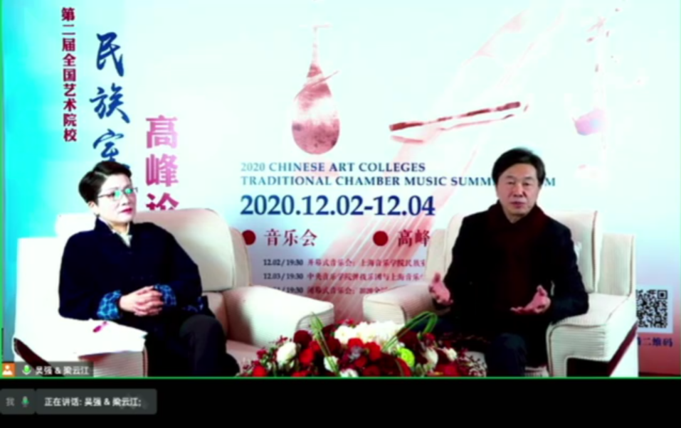 我系系主任梁云江教授受邀赴上海音乐学院,参加第二届全国艺术院校民族室内乐高峰论坛,并在《民族室内乐表演艺术研究》论坛现场和视频直播中就学科建设、培养模式、乐器演奏法、乐队组合形式等方面做主旨发言。论坛由上海音乐学院民族音乐系教授、博导、重合奏教研室主任、上音民乐团团长吴强指挥主持。