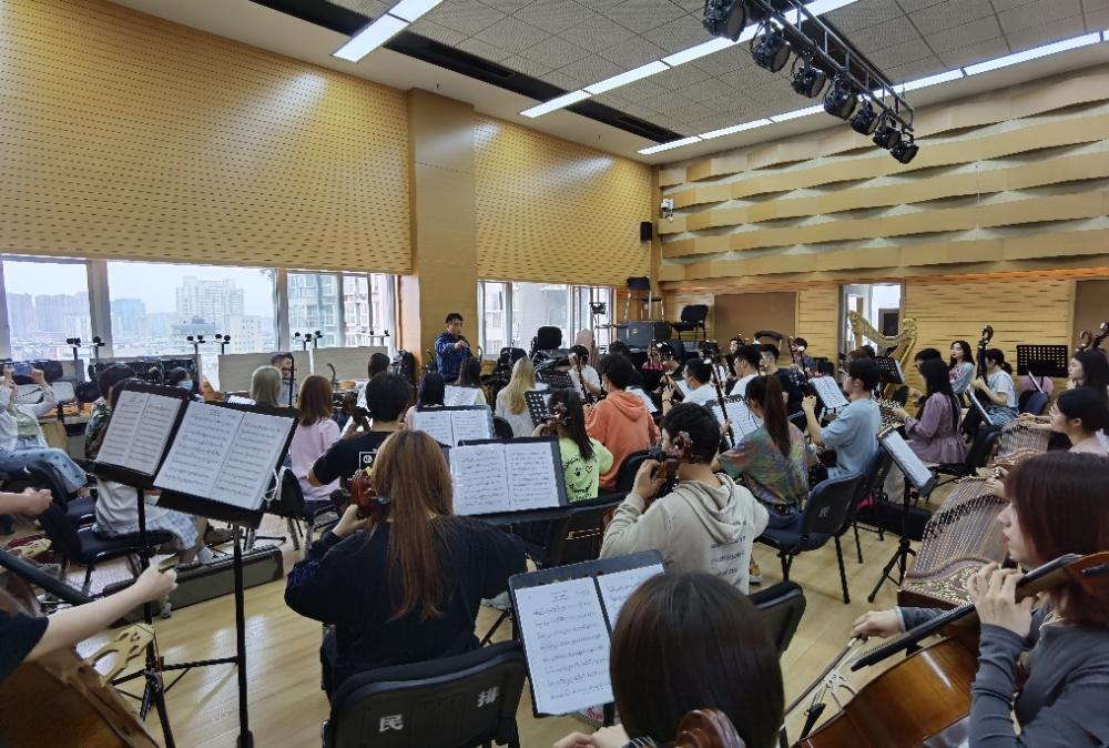 5月26日,西安音乐学院副教授、西安音乐学院民族管弦乐团常任指挥高伟老师,在民排厅为民乐系系青年民族乐团70余名学生进行指导排练,曲目《我的祖国》。