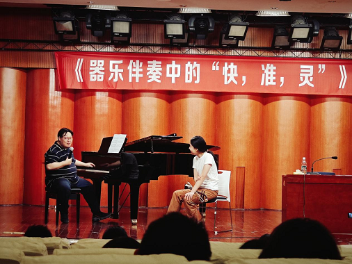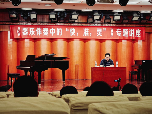 这场讲座不仅吸引了许多学生和音乐爱好者前来聆听,也吸引了不少专业音乐老师的到场。在本次讲座中,曲大卫老师首先介绍了伴奏的基本概念和作用,强调了伴奏在音乐表现中的重要性。接着,他深入浅出地讲解了如何在演奏中做到快、准、灵,包括节奏感的培养、多样化的伴奏技巧、以及如何与主奏者协同演奏等方面。